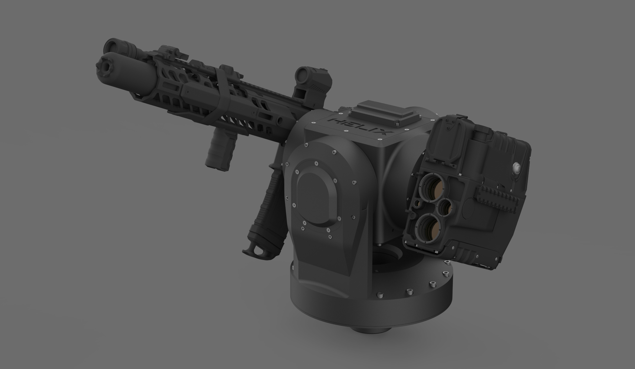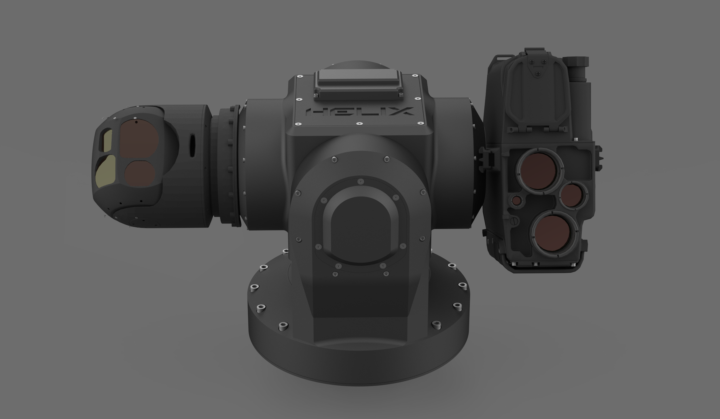 HELIX is a heavy-payload, high-speed, multi-axis stabilized platform capable of supporting up to 250 pounds of combined payload in dual-payload configurations. It is designed for initial deployment on ground vehicles and fixed-site installations, with support for continuous azimuth rotation and stabilized operation at vehicle speeds up to 100 mph.